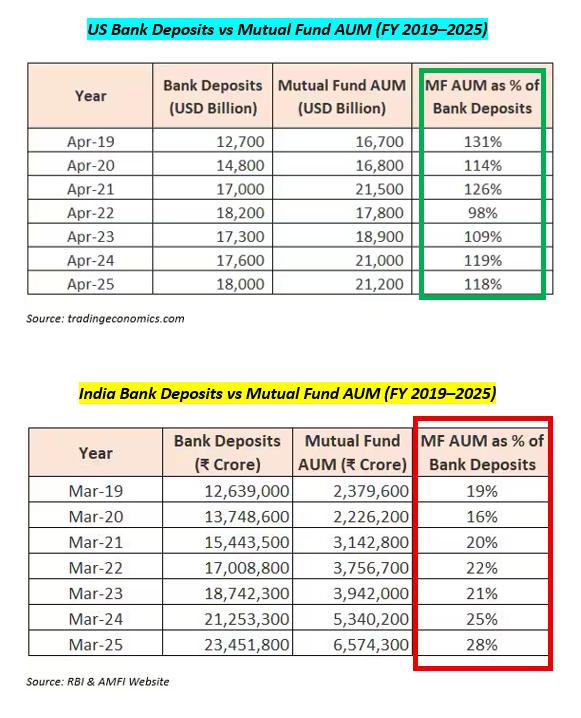 👉 Takeaway: In mature markets like the US, investors allocate aggressively towards equity and mutual funds. The industry is as large as the deposit base, reflecting deep financialisation and trust in capital markets.